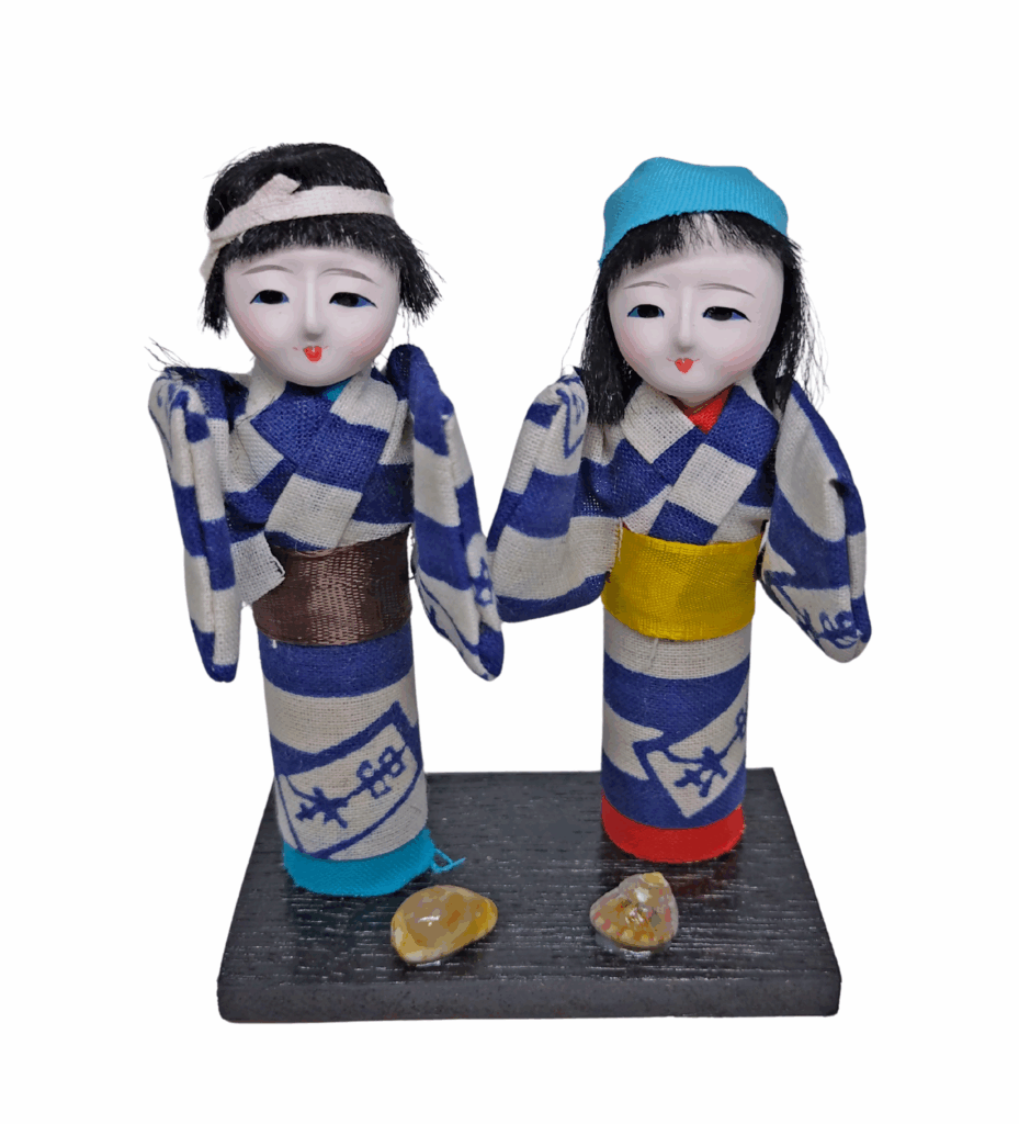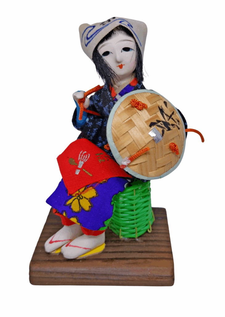 Proso było jedzeniem biedaków i ludzi w trudnym położeniu (np. wojowników w niełasce) – tych, których nie było stać na ryż. Istnieje np. legenda o wojownikach klanu Taira, którzy uciekli ze stolicy po tym, jak dominację zyskał wrogi klan Minamoto i znalazłszy się na Kiusiu, cierpieli głód i ból rozstania z bliskimi. Lalki przywołują właśnie tę ideę ubóstwa, ale i po prostu skromnego życia. Jak to często bywa z lalkami regionalnymi, jakość ich wykonania ustępuje tym z Kioto, Tokio czy Saitamy (ale są przez to też znacznie tańsze). Jedna z lalek na zdjęciu poniżej stoi na czymś, co przypomina dekiel od farby albo podstawkę od doniczki – w pierwszej chwili myślałam, że jest dorobiona, ale nie, ma oryginalną naklejkę, czyli taki właśnie „zamysł” miał jej twórca.
