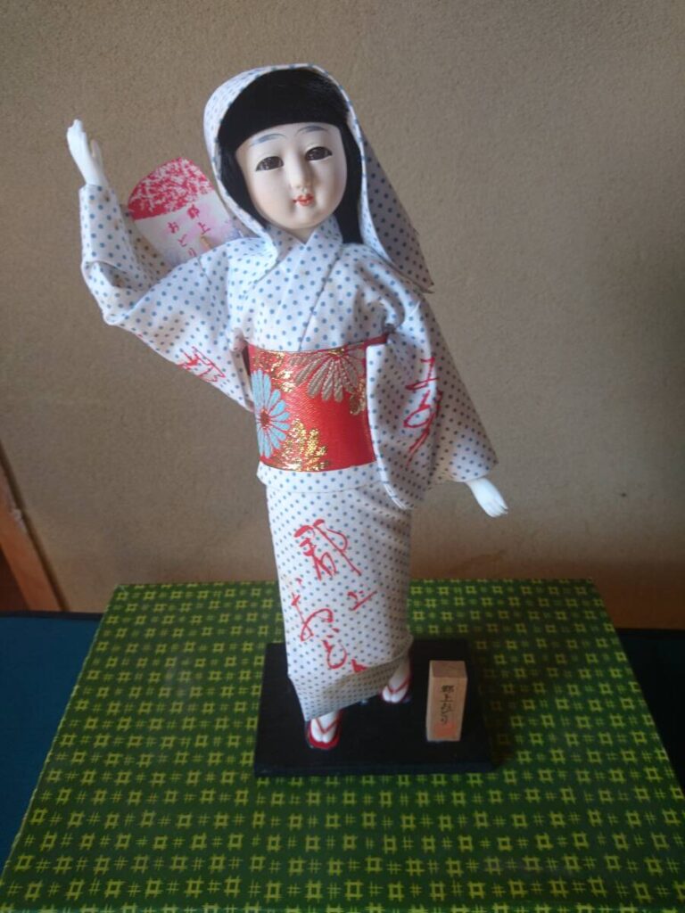 [zdjęcie: lalka regionalna z miasta Ureshino w pref. Saga, słynącego z gorących źródeł (stąd podpis: Ureshino Onsen) oraz herbaty (stąd lalka ma postać zbieraczki herbaty). Lata 50.-60. XX wieku. Lalka z mojej kolekcji]